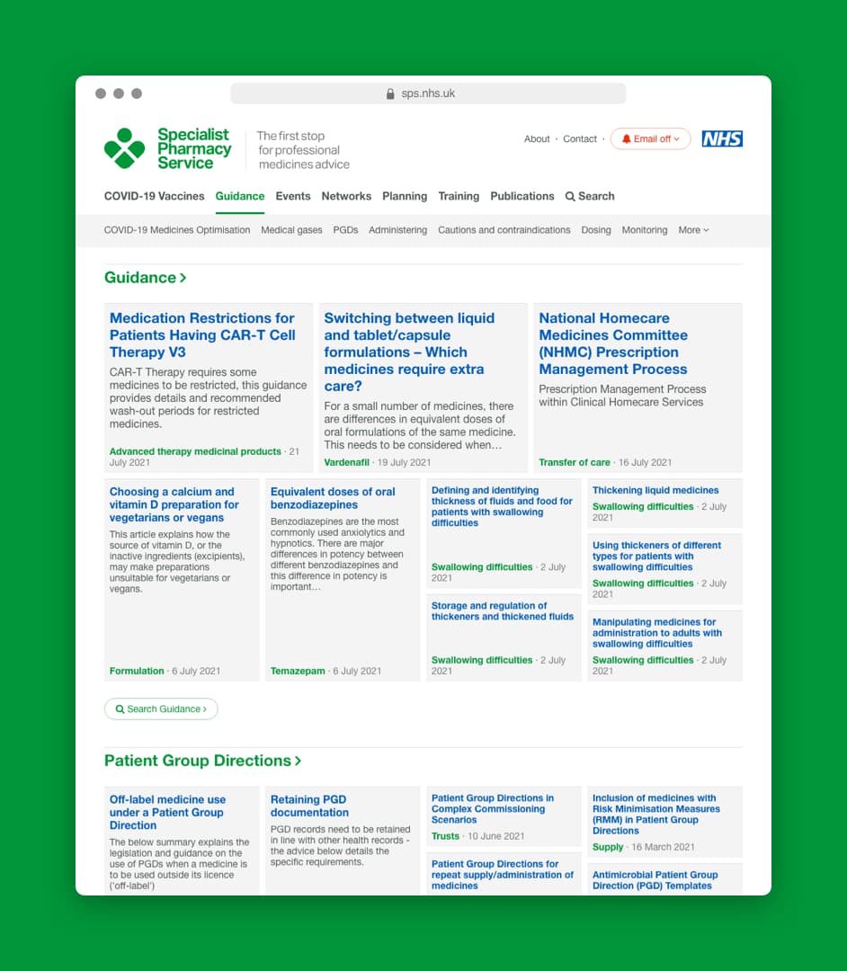 We also addressed a long-standing problem of users not knowing or realising what content was on offer, e.g. with dentists or GPs frequently thinking SPS was for more of a pharmacy-specific setting and not for them. Now that content was starting to be written using our HTML authoring tools we knew we would be more able to create themed collections of content as well as related articles.