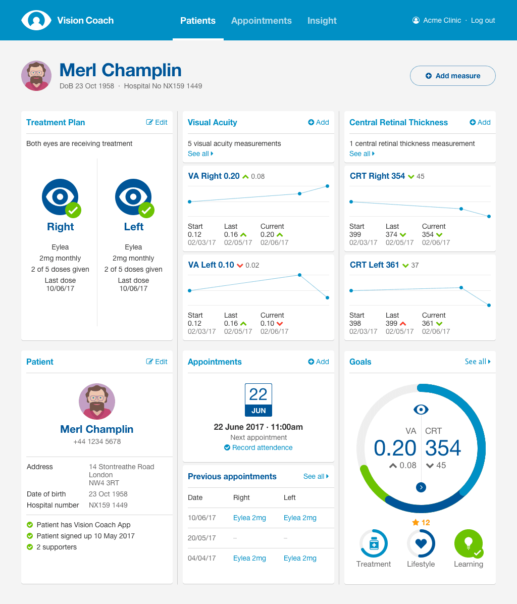 I was lead product designer of a team creating an app and web platform to help manage and prevent deteriorating eye health for patients and clinicians.