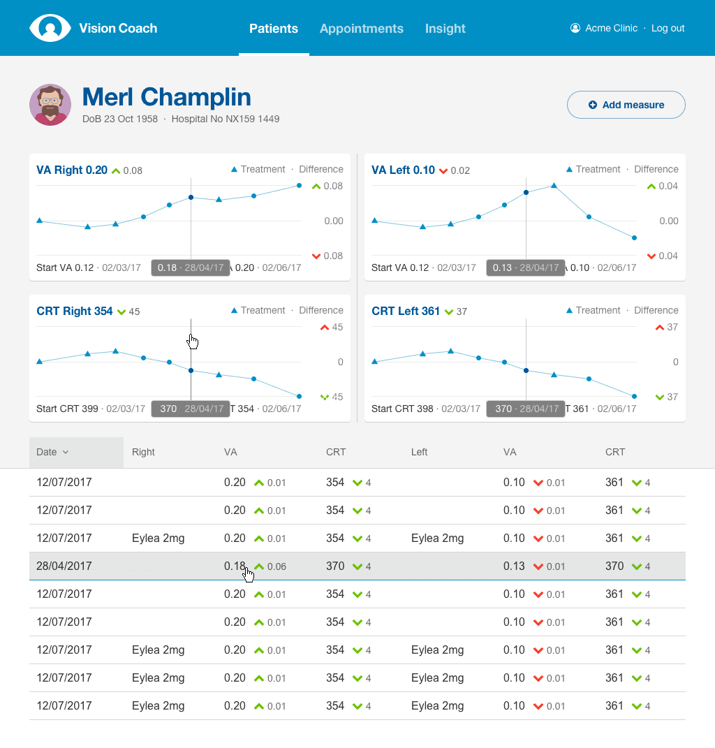 Clinicians access a secure dashboard which provides a treatment overview and trends for a particular patient, helping them quickly spot changes and adjust care plans.